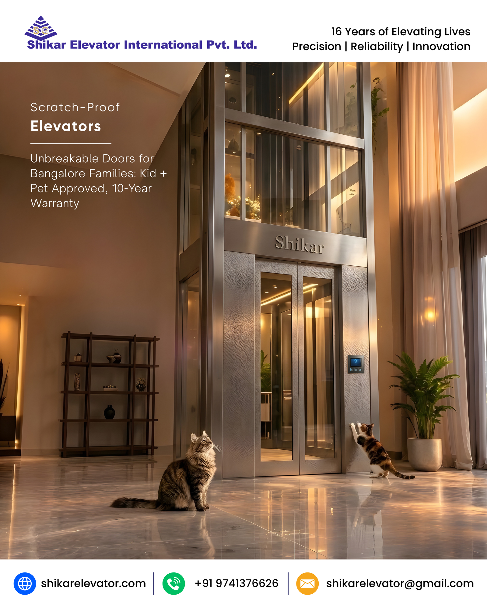 Note: Get pet-proof elevator perfection today! Contact Shikar Elevators Bengaluru for free consultations, scratch-proof elevator price quotes, and stainless steel door samples. 10-year warranty family luxury starts now!